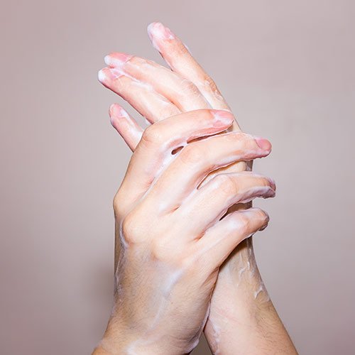 Square image of hands covered in cream on grey background